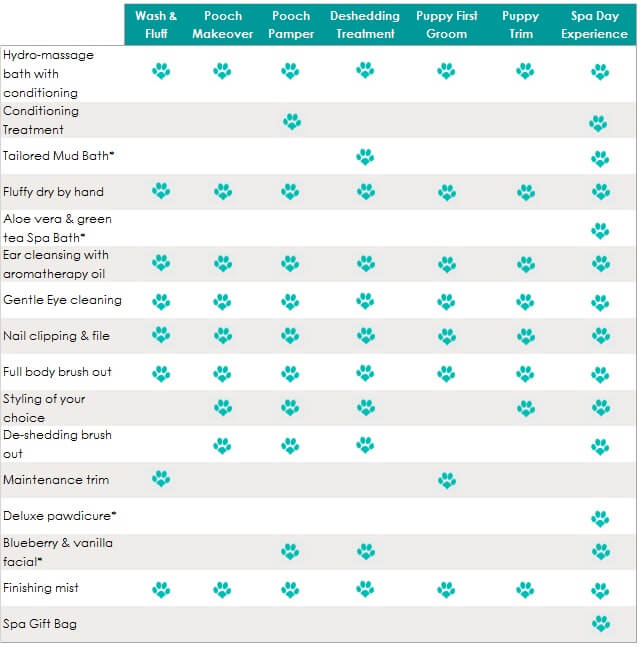Below is a quick reference guide detailing what is offered in each of our grooming packages. Treatments showing this symbol * can be added to any grooming package where they are not already included.